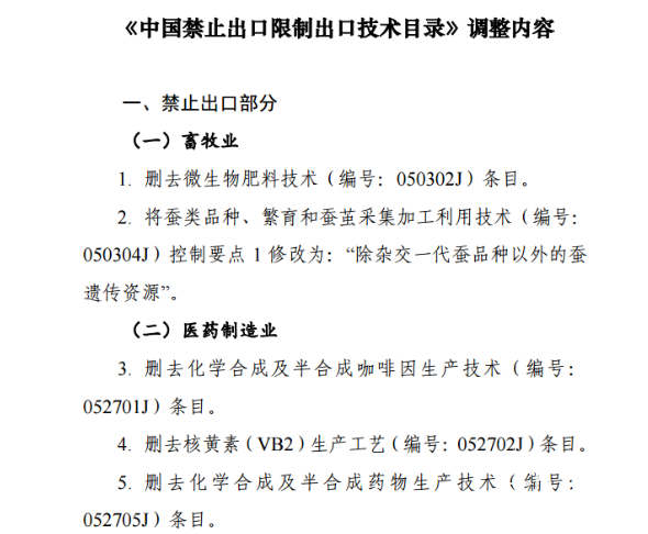 8月28日,商務(wù)部、科技部發(fā)布《中國禁止出口限制出口技術(shù)目錄》,其中對醫(yī)藥制造業(yè)做了如下規(guī)定: