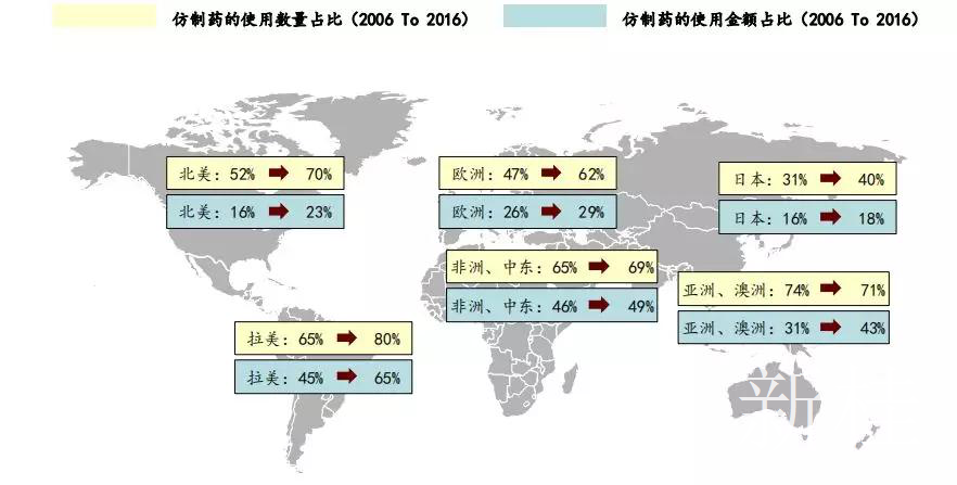 根據(jù)統(tǒng)計,2016年全球仿制藥市場規(guī)模達(dá)到2200億美元,2006-2016年全球各大藥品市場中,仿制藥的處方量和處方金額占比都呈現(xiàn)明顯提升。