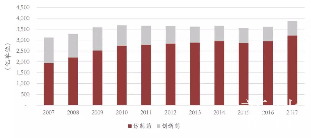 美國醫(yī)藥市場是全球最大的醫(yī)藥市場,同時也是全球最大的仿制藥消費國,(2016年美國市場仿制藥銷售總額達(dá)到800億美元)。在2007-2017年,美國仿制藥市場規(guī)模的增速遠(yuǎn)遠(yuǎn)高于專利藥增速。2007-2017年,美國藥品市場的年復(fù)合增長率為8.2%,其中仿制藥為15.6%,專利藥為5.5%。