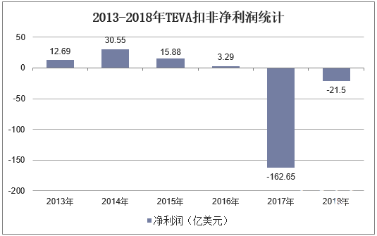 TEVA對Actavis的并購,可以看作是TEVA自身乃至歐美仿制藥巨頭走向衰落的開端。彼時,TEVA的仿制藥業(yè)務(wù)在100億美元的體量下開始增長乏力。同時,銷售規(guī)模高達(dá)56億美元的重磅創(chuàng)新藥產(chǎn)品格拉替雷即將專利到期,面臨專利懸崖。2018年TEVA凈利潤虧損21.5億美元。2013-2018年TEVA扣非凈利潤統(tǒng)計