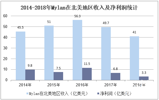 不僅僅是TEVA,從Mylan的財報中也可以看出其美國仿制藥業(yè)務(wù)近年來開始承受到較大的業(yè)績壓力。2017、2018年Mylan在北美地區(qū)收入和利潤連續(xù)兩年呈現(xiàn)下滑態(tài)勢。2018年Mylan在北美洲營收41億美元,凈利潤3.3億美元。