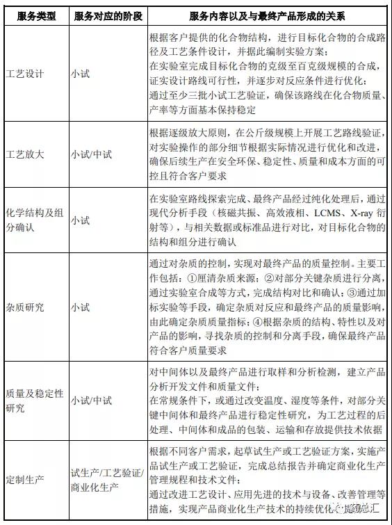 第一、CDMO 服務(wù)是最終商品形成的業(yè)務(wù)過(guò)程。公司為客戶提供的 CDMO 服務(wù)的主要目標(biāo)是按照客戶要求成功研發(fā)出具備商業(yè)化生產(chǎn)可行性的醫(yī)藥中間體或原料藥等產(chǎn)品。CDMO 服務(wù)是最終產(chǎn)品得以形成的過(guò)程。公司提供的各項(xiàng) 服務(wù)內(nèi)容及其與最終產(chǎn)品形成的關(guān)系如下: